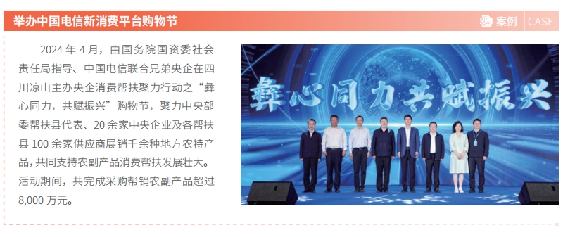 中国电信始终将消费帮扶作为促进脱贫地区特色产业提质增效和持续发展的重要途径,积极参与国务院国资委“央企消费帮扶聚力行动”“央企消费帮扶兴农周”,直接购买脱贫地区农产品 3.3 亿元,帮助销售脱贫地区农产品 4.43 亿元。