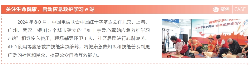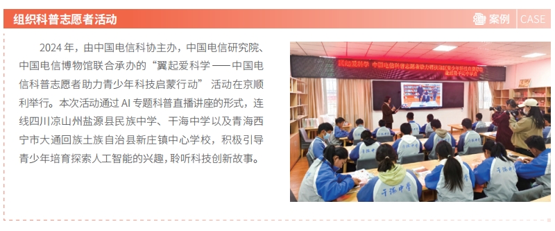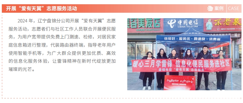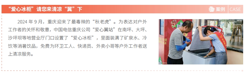 中国电信持续升级“爱心翼站”公益服务,以有温度的服务关怀社会特殊群体,塑造红色电信“办实事解民忧”的服务“金名片”。焕新“关爱随心”爱心翼站服务举措,开展“一老一少”关爱行动,联合中国电信博物馆在 29 省份 104 个城市开展“探索通信的奥秘”青少年科普课堂,组织“让爱无碍”“重阳敬老”等公益活动。惠民服务加载 9 万家城乡营业厅,全年爱心活动达到 18 万场,为户外劳动者、老年人、青少年等群体服务超过 1,800 万人次。创新数智化公益服务,推出包含智能监控、智能语音在内的“智慧工会驿站”解决方案,服务覆盖超过 3,400 家站点。健全爱心翼站志愿服务,志愿服务队伍达到 570 支,带动企业员工参与志愿服务 2 万小时。全国“工会驿站”网点规模贡献第一,荣获中华全国总工会“工会驿站双 15 工程重要贡献单位”,爱心翼站助老志愿服务荣获第七届中国青年志愿服务项目大赛全国铜奖,选送的爱心翼站相关服务案例入选国务院国资委《中央企业社会责任蓝皮书(2024)》十佳案例。