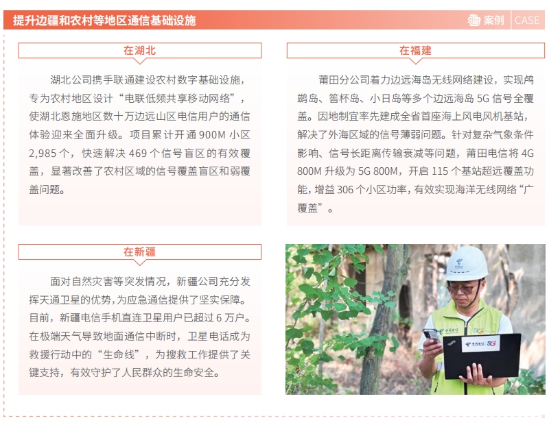中国电信致力提升边疆和农村等地区通信基础设施供给能力,高质量开展第九、第十批电信普遍服务建设任务,加快推进“宽带边疆”建设,进一步缩小“数字鸿沟”,助力兴边富民、稳边固边,赋能乡村振兴发展。持续深化共建共享,与中国联通在广西防城港、百色等地区,开展 4/5G 接入网共享全网通试点并验证成功,为拓展农村和边疆地区建设手段、加快实现覆盖目标提供技术方案。