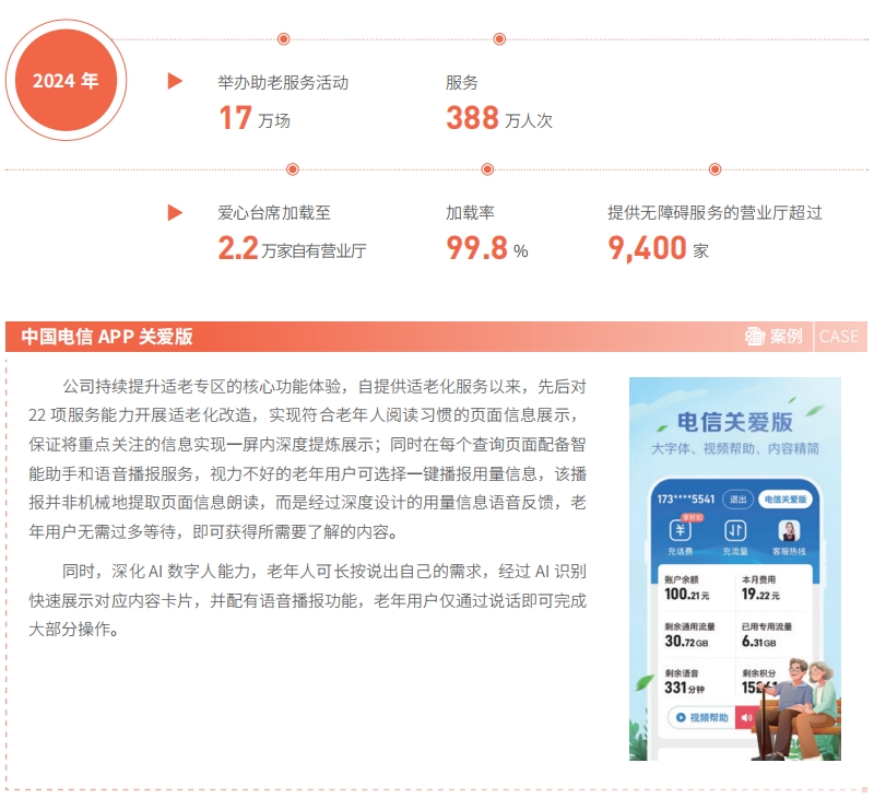 2024 年,中国电信 10000 号人工热线累计为 65 岁及以上的老年客户提供 1,800 万余次直接进入尊老专席的暖心服务;为不便出行的老年人等群体提供面对面、一对一的远程柜台视频服务业务办理 16 万余次。开展“爱心翼站 +”特色助老服务,指导老年人使用微信、电商购物、网上挂号、在线缴费、云盘等;联合中国医药教育协会、北京老年科技大学等单位开展康养云课堂、老年健康知识大赛等活动。全年举办助老服务活动 17 万场、服务 388 万人次;爱心台席加载至 2.2 万家自有营业厅,加载率 99.8%,超过 9,400 家营业厅提供无障碍服务。中国电信 APP 围绕服务能力补全和AI 助老两个方向进行全面深化改造,关爱版服务能力进一步提升,全年总计完成六项适老化功能改造,与标准版更加同权;同时对 AI 数字人助老能力进一步拓展,完成客服场景、搜索场景的融合。