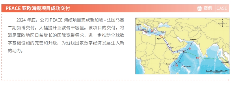 中国电信重点投资亚太和共建“一带一路”国家或地区,建成较大规模的全球网络,形成了以亚太为重点,非洲中东、欧洲和美洲等区域差异化的发展格局。截至 2024 年底,公司参与投资建设超过 50 条国际海缆,国际及港澳台骨干传输中继超过 100T,其中“一带一路”方向超过 50T,拥有 254 个海外网络服务点(POP)。