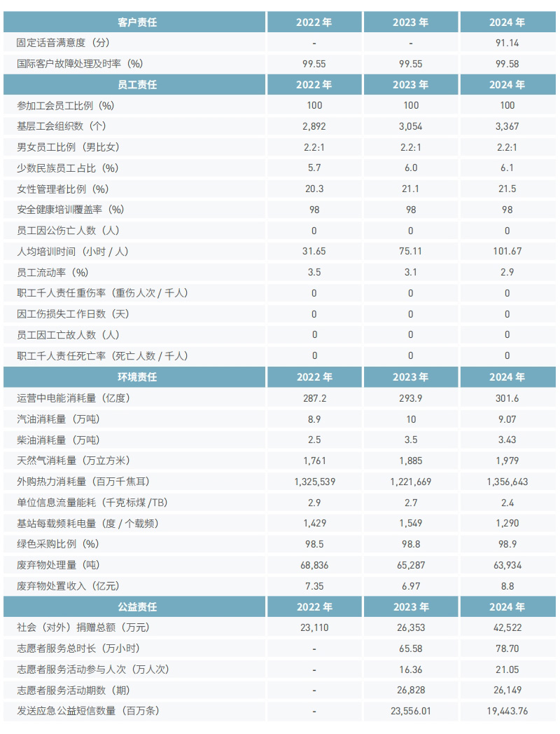 共建和谐美好社会。主动适应行业监管新要求,严格遵守相关法律法规,推动行业健康、规范、有序发展。始终坚持绿色发展理念,多管齐下打造绿色云网,推动绿色运营。提升服务能力,着力解决广大客户的急难愁盼问题。全力推进乡村振兴,将企业数字化能力优势转化为帮扶优势,不断巩固拓展脱贫攻坚成果,助力乡村振兴。持续提升客户服务,加快推进服务型企业建设。保障员工权益,完善人才队伍建设制度,充分调动员工积极性,激发员工活力,弘扬劳模精神和工匠精神,关心关爱员工生活。积极支持科教文卫等社会事业的发展。广泛参与“一带一路”建设,积极在海外履行社会责任,助力相关国家(地区)经济社会发展。